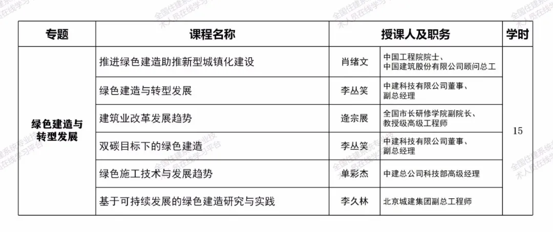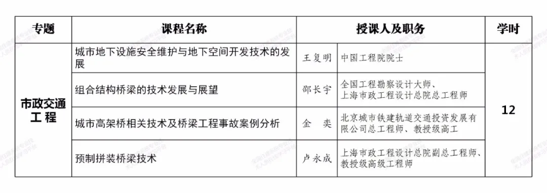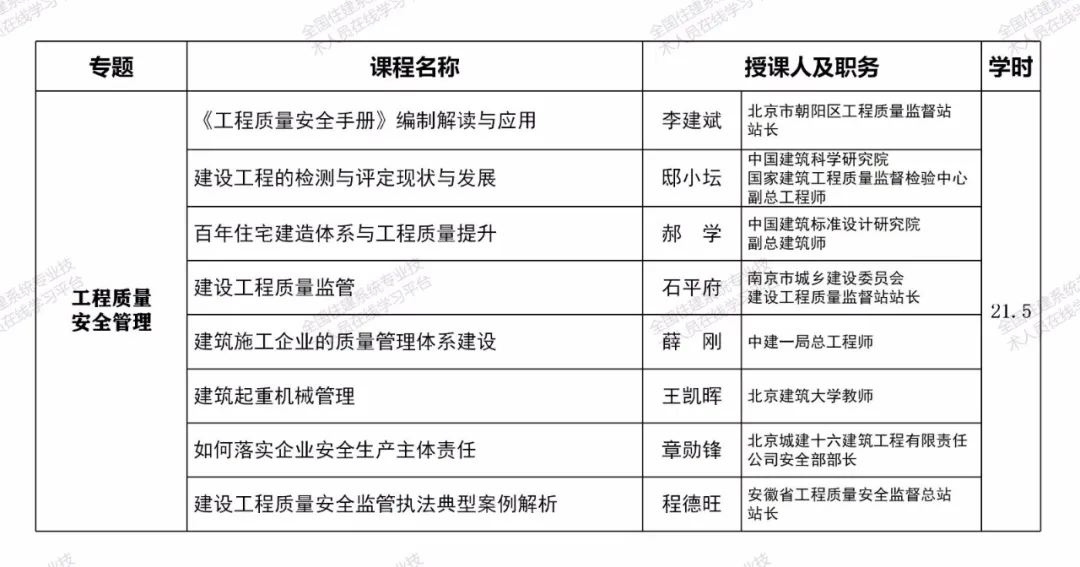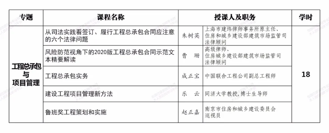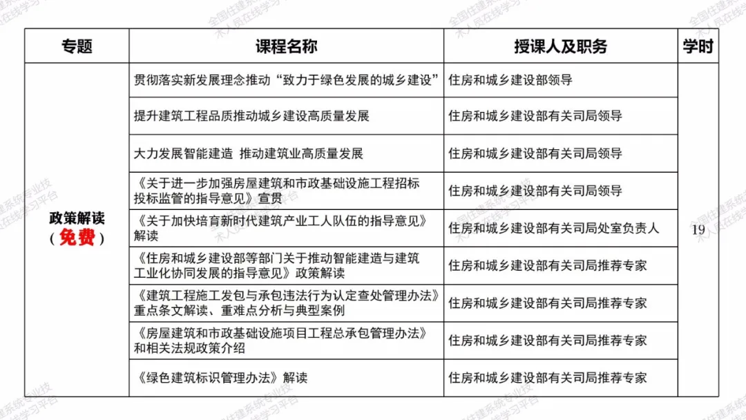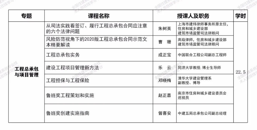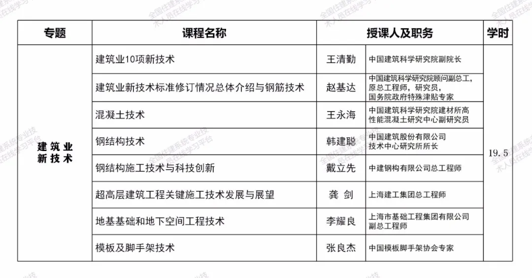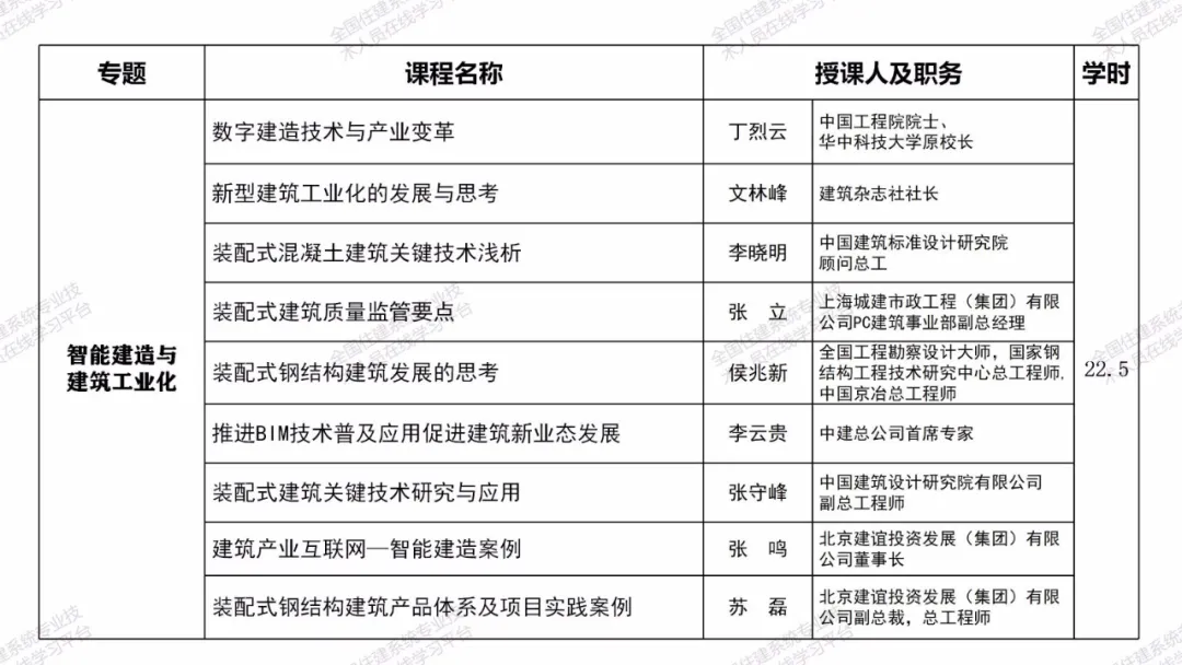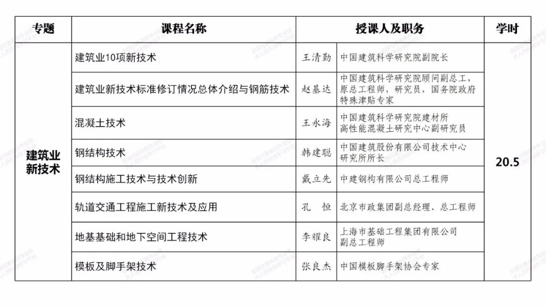 相关课程均由工程建设领域有关专家和行业领导主讲,师资权威高端,内容紧密围绕工程建设域新政策、新技术、新标准、新方法,能够较好地满足一级注册建造师继续教育学习需求,助力提升职业素质和执业水平。注册两个及以上专业的,毎增加一个专业,建议选择增加专业的选修课程学习即可。课程也可适用于二级注册建造师继续教育学习。一级注册建造师其他专业继续教育课程也将陆续推出,敬请期待。