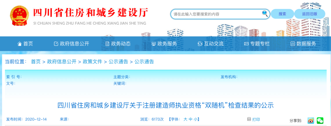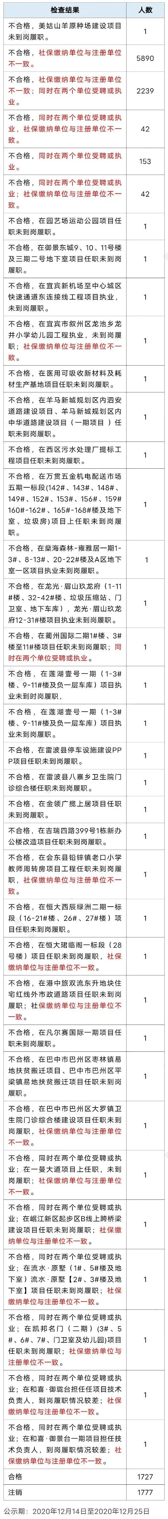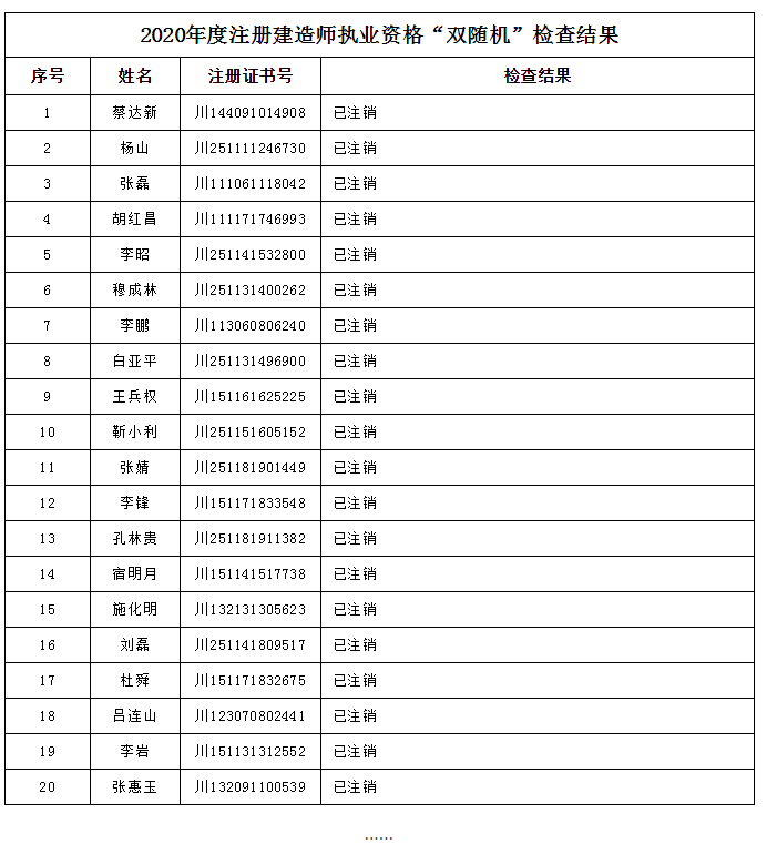 根据《四川省人民政府关于在全省市场监管领域全面推行部门联合“双随机、一公开”监管的实施意见》(川府发〔2019〕23号)的规定,住房城乡建设厅会同各地住房城乡建设行政主管部门在全省范围内开展2020年度注册建造师执业资格“双随机”检查,现将检查结果公示。公示期:2020年12月14日至2020年12月25日。