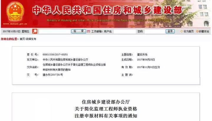 据住建部10月13日消息,住建部连发两份文件要对监理工程师注册申请材料简化,文件内容分别为《关于修订印发《注册监理工程师注册管理工作规程》的通知》和《住房城乡建设部办公厅关于简化监理工程师执业资格注册申报材料有关事项的通知 》。通知公布《注册监理工程师注册管理工作规程》已进行了修订,自2017年11月1日施行。