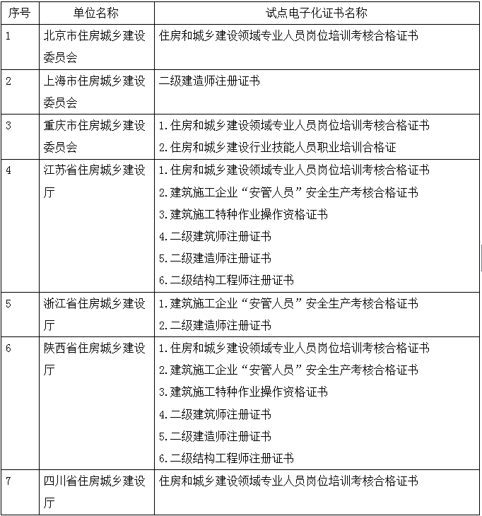5月23日住建部发布关于同意在部分地区开展住房和城乡建设领域从业人员有关证书电子化试点的复函,同意北京市、上海市、重庆市、江苏省、浙江省、陕西省、四川省开展住房和城乡建设领域从业人员相关证书电子化试点,电子化证书与纸质证书具有同等效力。